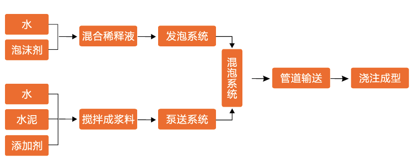 气泡混合轻质土的生产过程包括:泡沫制备、料浆制备、浆泡混合、泵送、浇注成型、养护、检验。